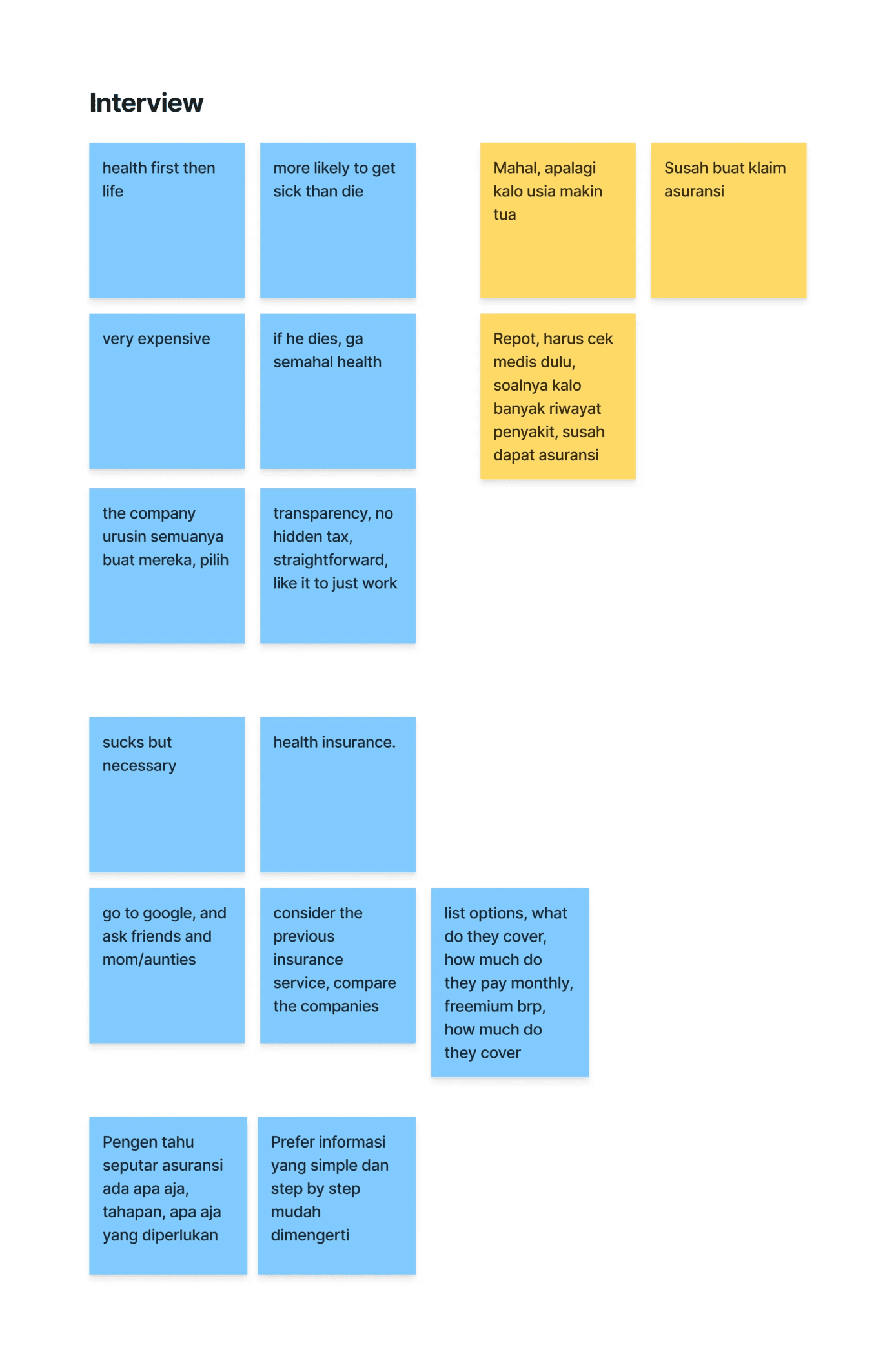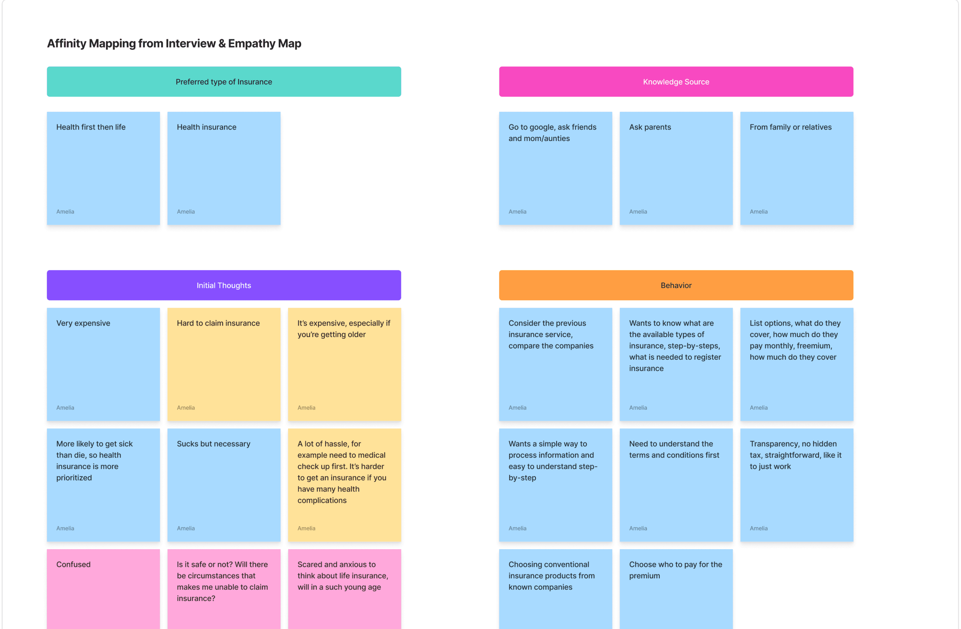 I wanted to study younger generation’s decision making and how they feel when they want to apply for insurance. Therefore, I conducted user-interviews and had a peer-to-peer brainstorming insights to discover the main concerns.