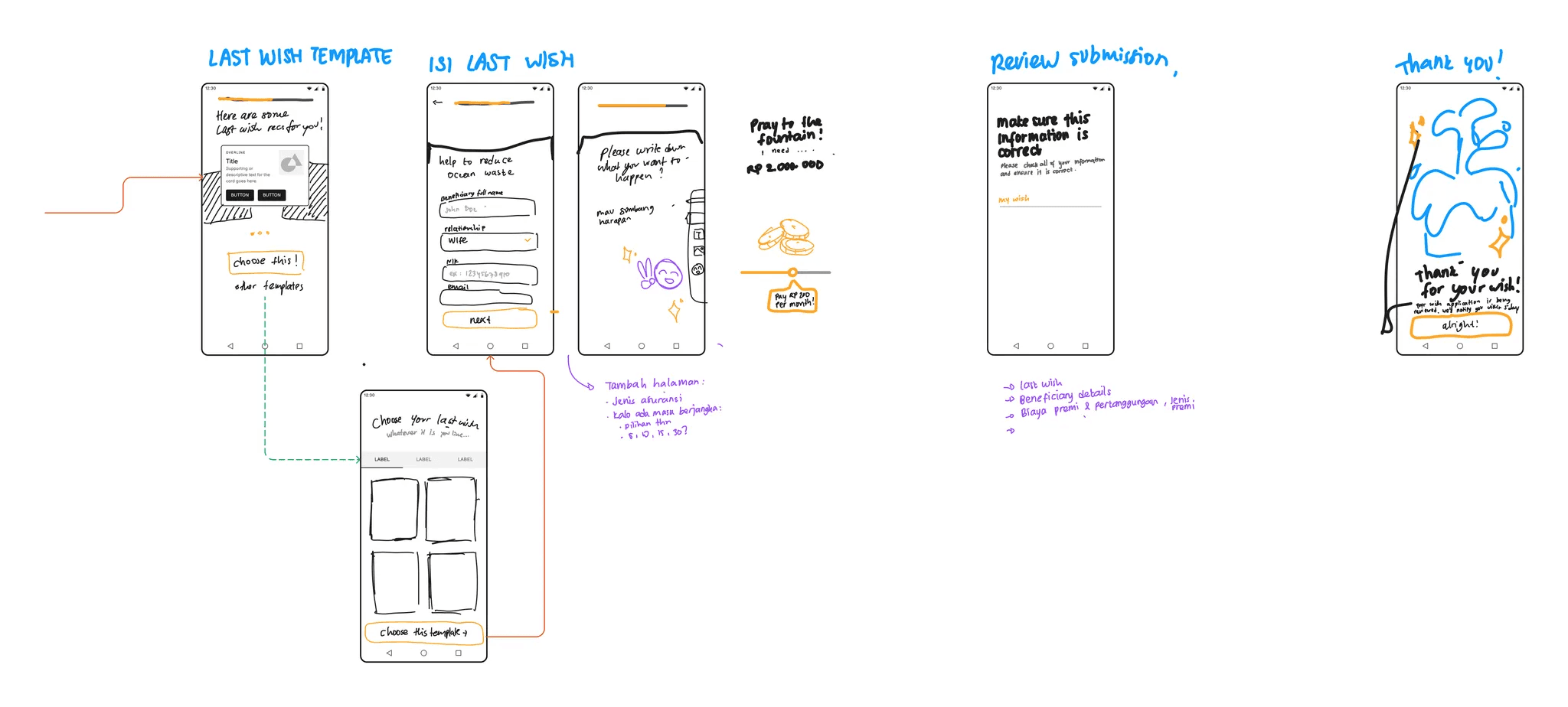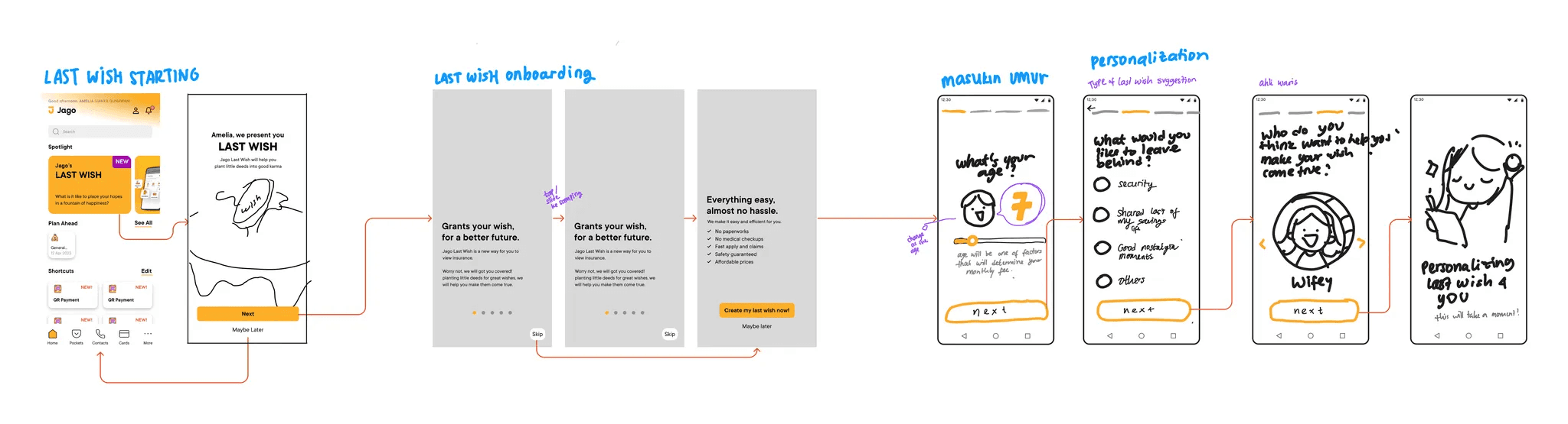 Initial low fidelity and flow sketch of the entire Last Wish Feature